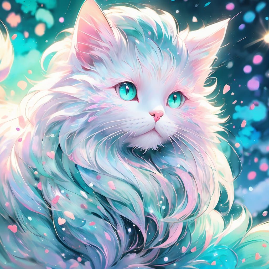 A charming anime-style cat portrait featuring turquoise eyes and white-tipped hair. The whimsical, kawaii-style illustration has shimmering fur, sparkling eyes, and a soft pastel color palette.