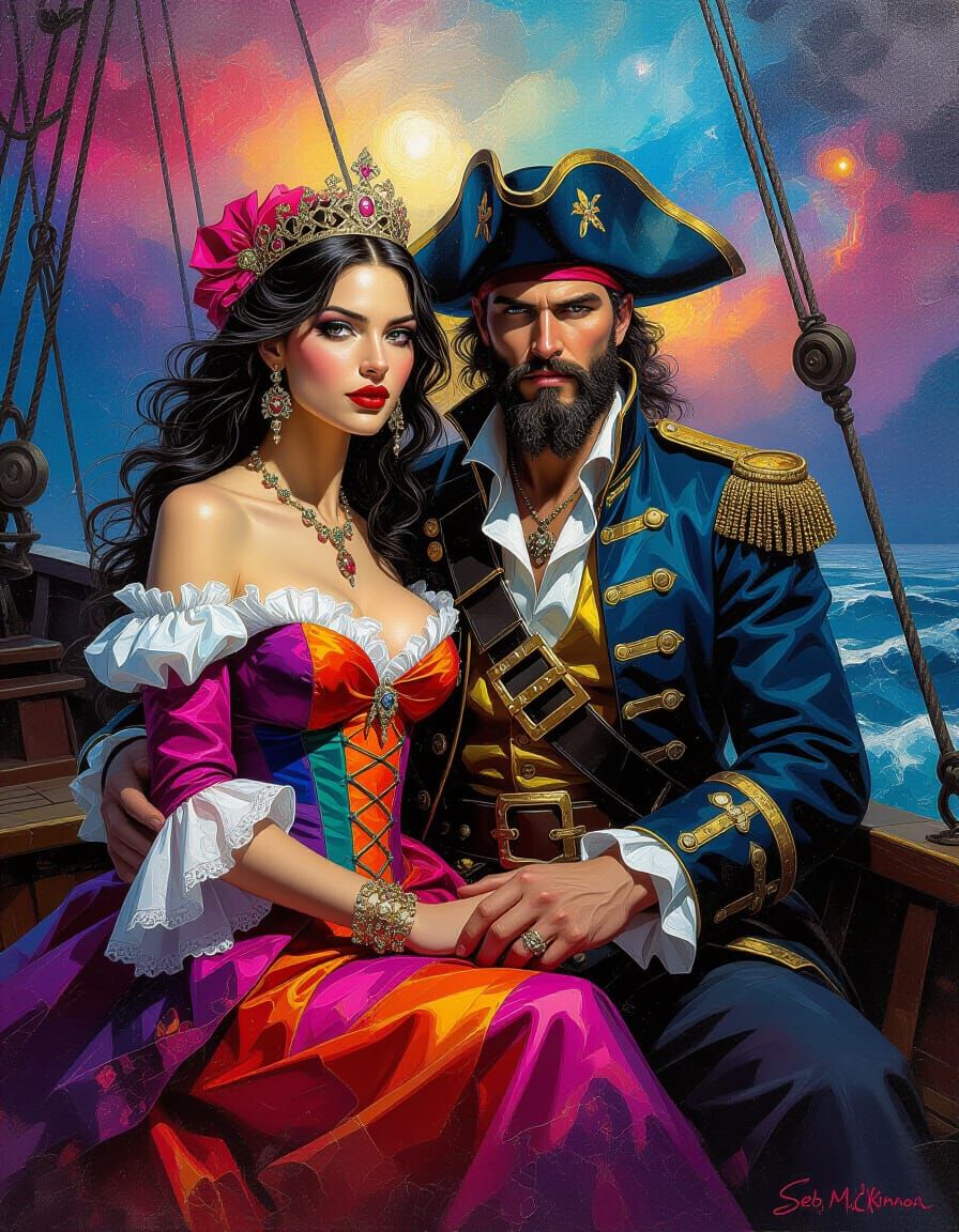 A striking picture of a pirate king and queen on a ship. The couple are depicted in a dark fantasy setting in a baroque style, with a mystical space background and vibrant colors as luxurious oil impasto.