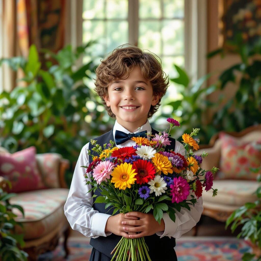 This image shows a smiling boy in elegant clothing holding flowers in a colorful room filled with plants and sofas. The illustration is in a whimsical art nouveau style.