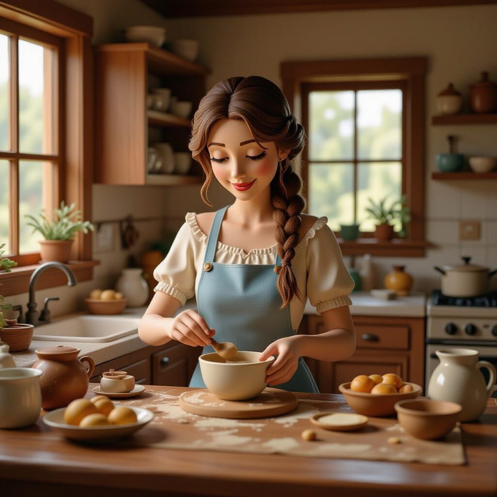 This image shows a young woman in a kitchen preparing breakfast, with everything constructed from clay. The scene is rendered as a detailed matte painting with complementary colors.
