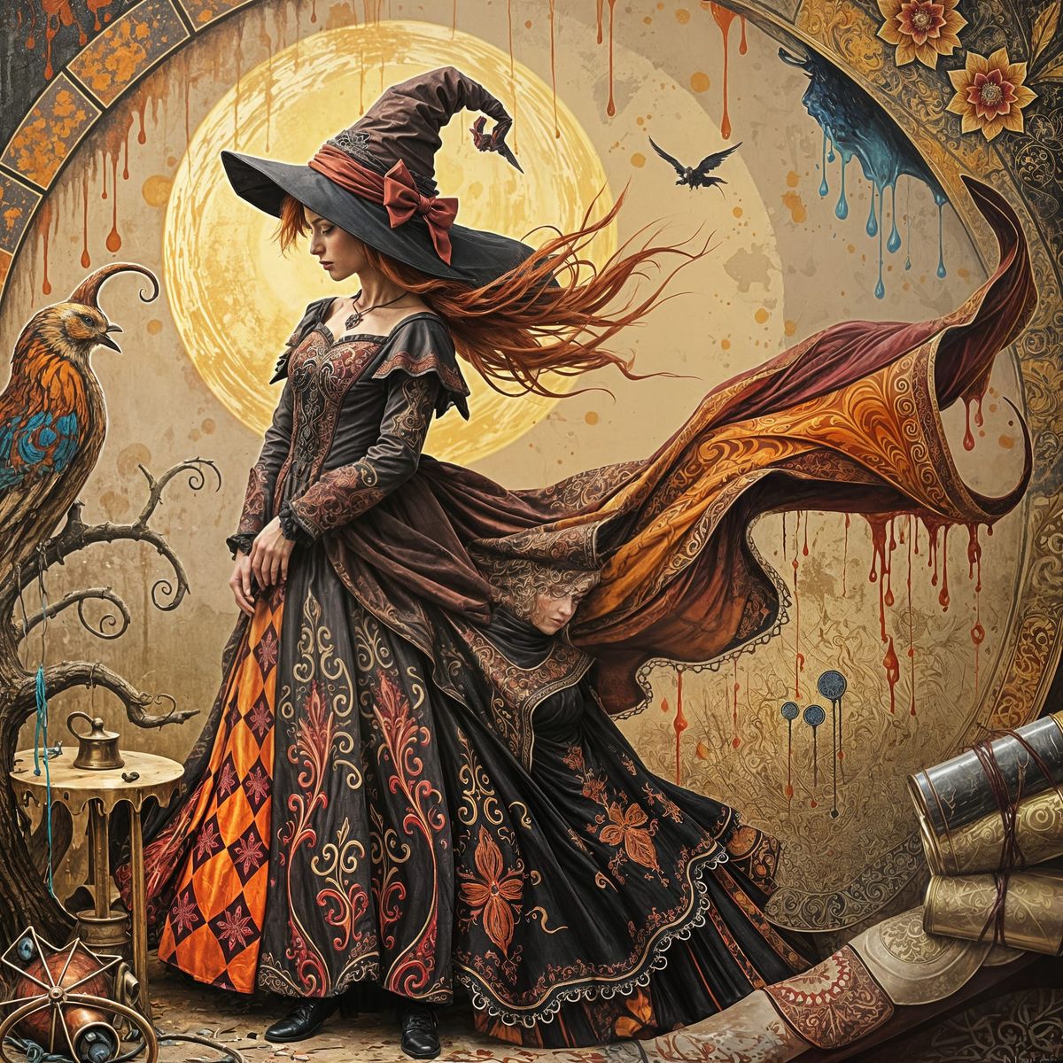 This image shows a striking 50-year-old witch with short orange hair, wearing a detailed brocade dress and a golden hat, rendered in a vibrant graffiti and splash art style.