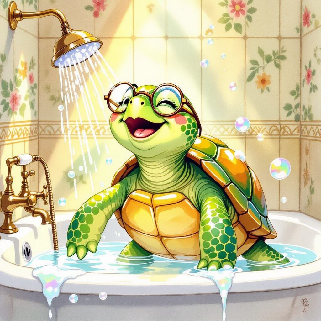 A whimsical image of an anthropomorphic turtle singing under a shower. The cozy Victorian bathroom scene features iridescent bubbles and is rendered in watercolor style.