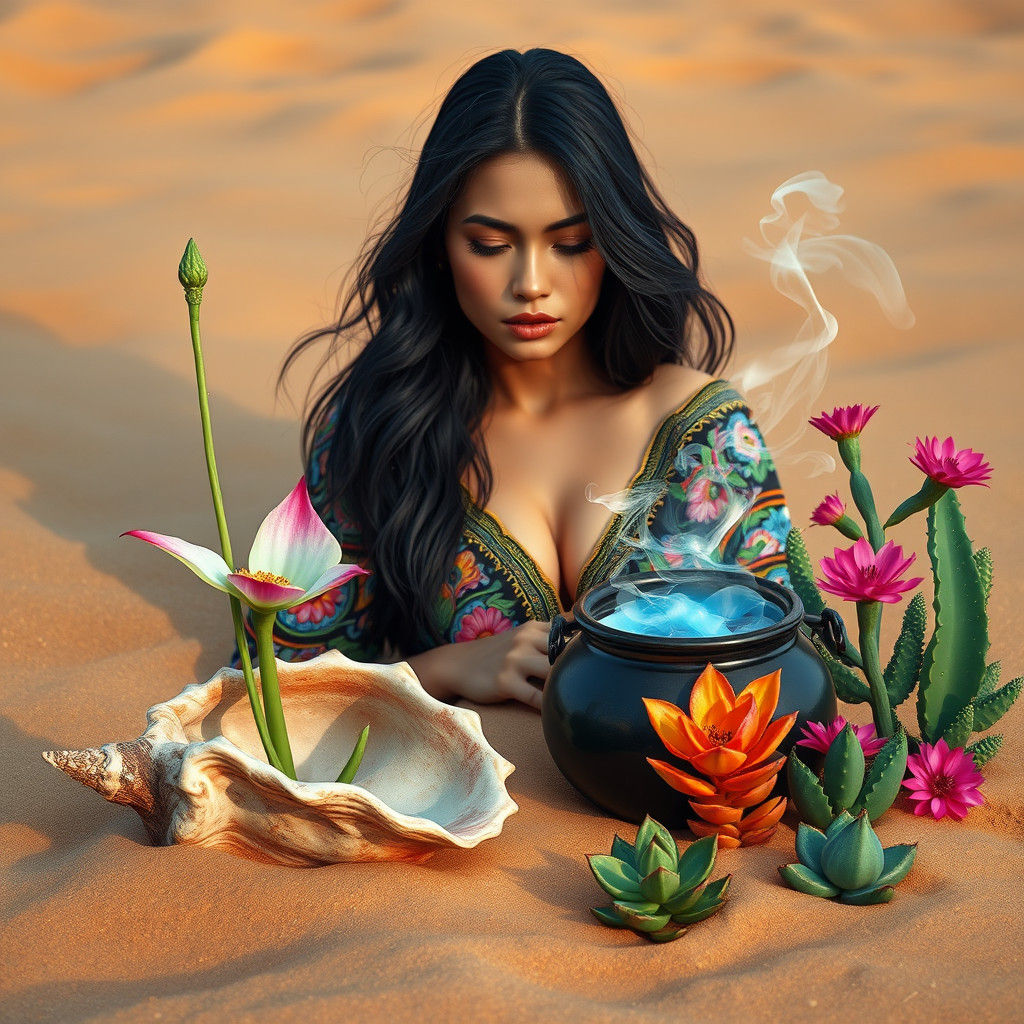 A vibrant image of a pale green aloe vera plant with a pink flower growing from a conch shell on a sunny beach. A sorceress stirs a cauldron amidst stylized graffiti and splash art.
