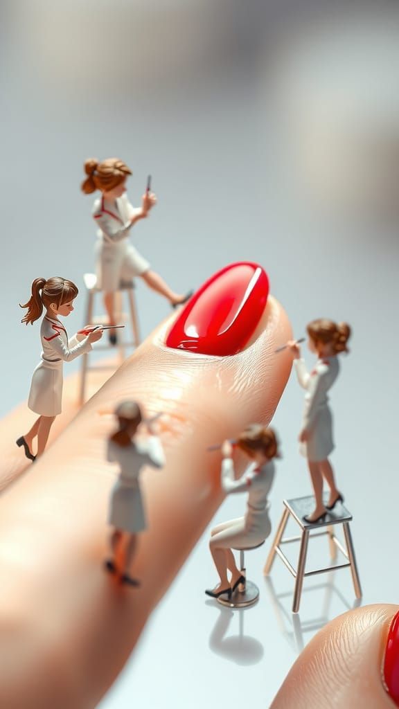 This whimsical illustration showcases miniature manicurists in crisp white uniforms carefully painting a single red fingernail. Delicate brushes and tools create a glossy finish, with vibrant lighting highlighting the tiny artists' precision work.