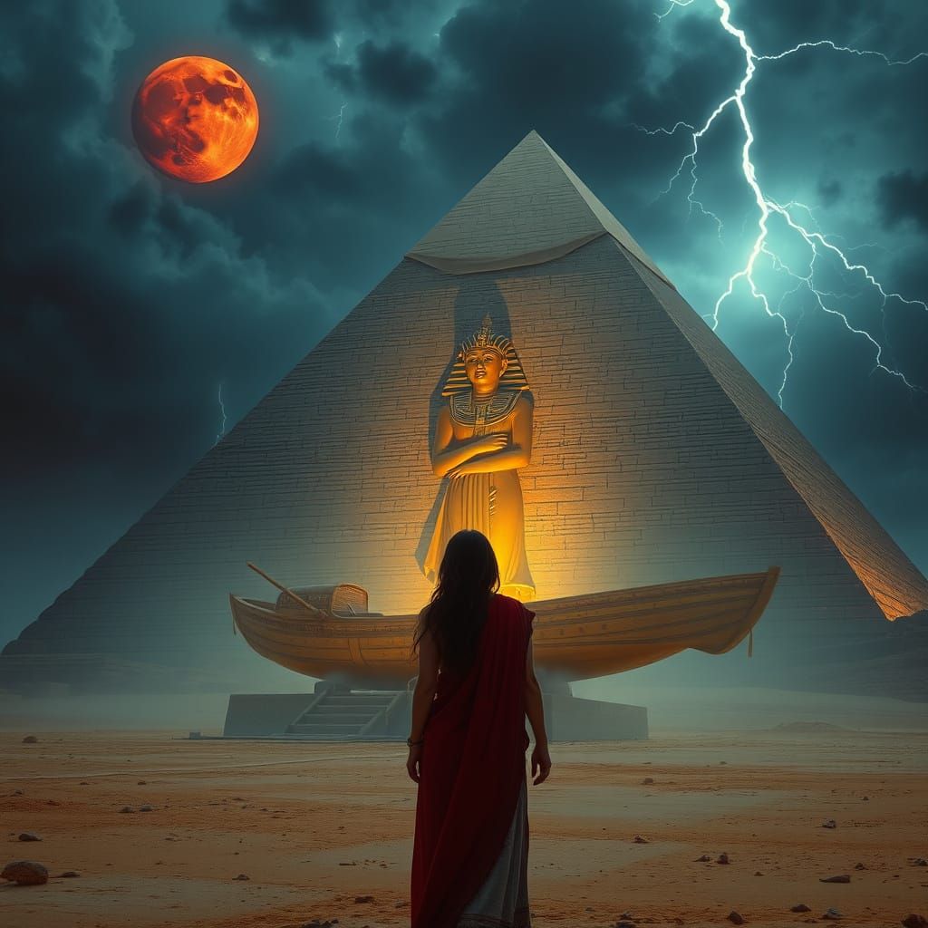 This image shows a woman in Egyptian garb before the Giza pyramid. Buddha is carved into the stone. The scene includes a funerary boat with a mummy under a stormy sky in a retro science fiction style.