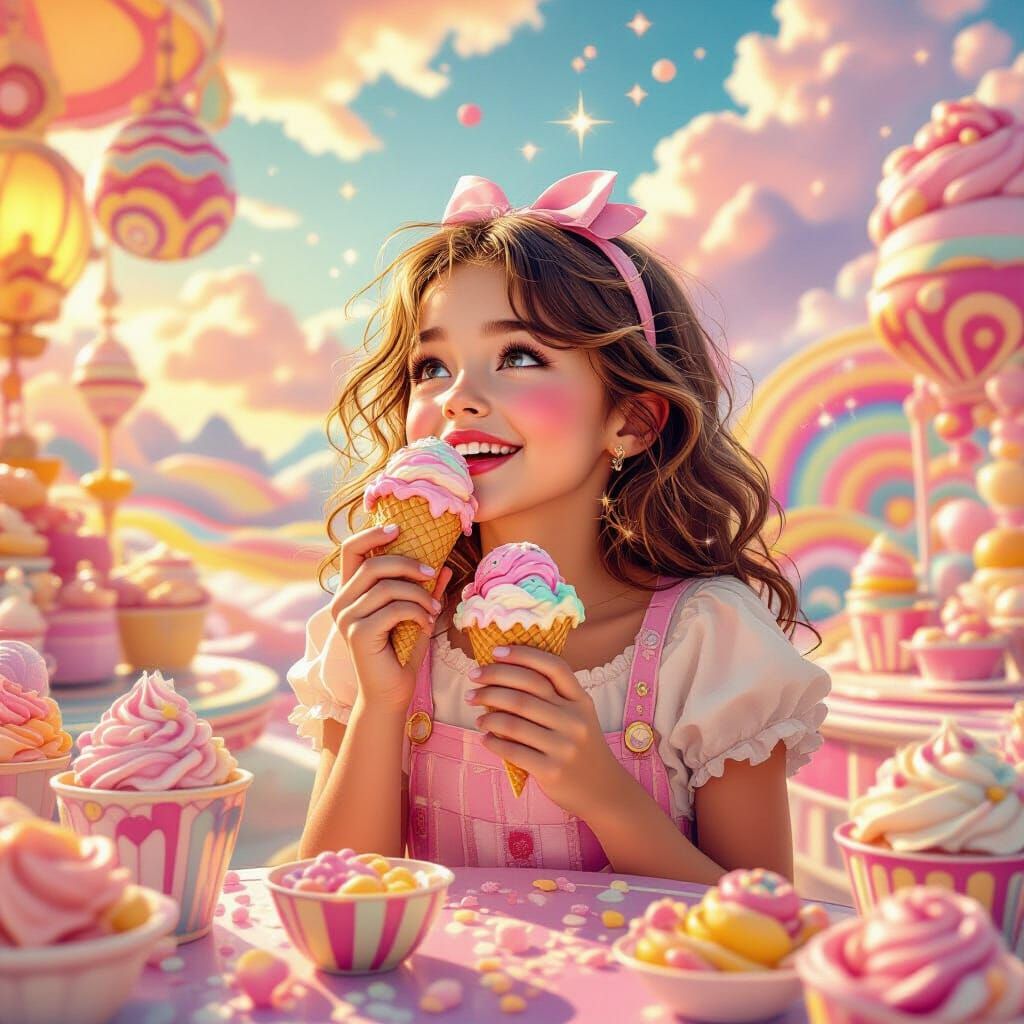A vibrant oil painting of a girl enjoying ice cream in a candy shop. The fantasy landscape features swirling patterns, sugar crystals, and warm lighting under a pastel rainbow sky. Rendered as 3D digital art.