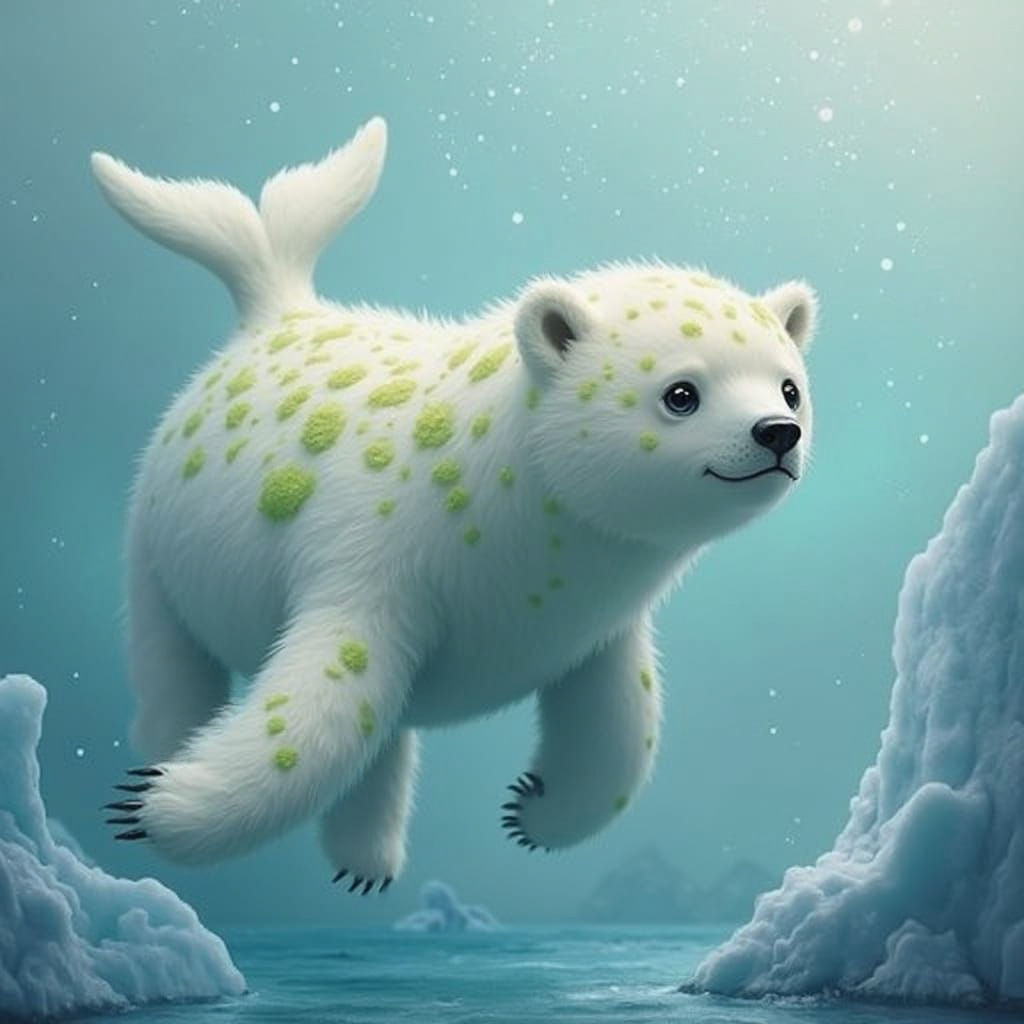 This image features a unique creature with a polar bear face, a beluga whale body, and a moss-covered skin, set against a breathtaking backdrop of iceberg water and the vibrant colors of the northern lights.