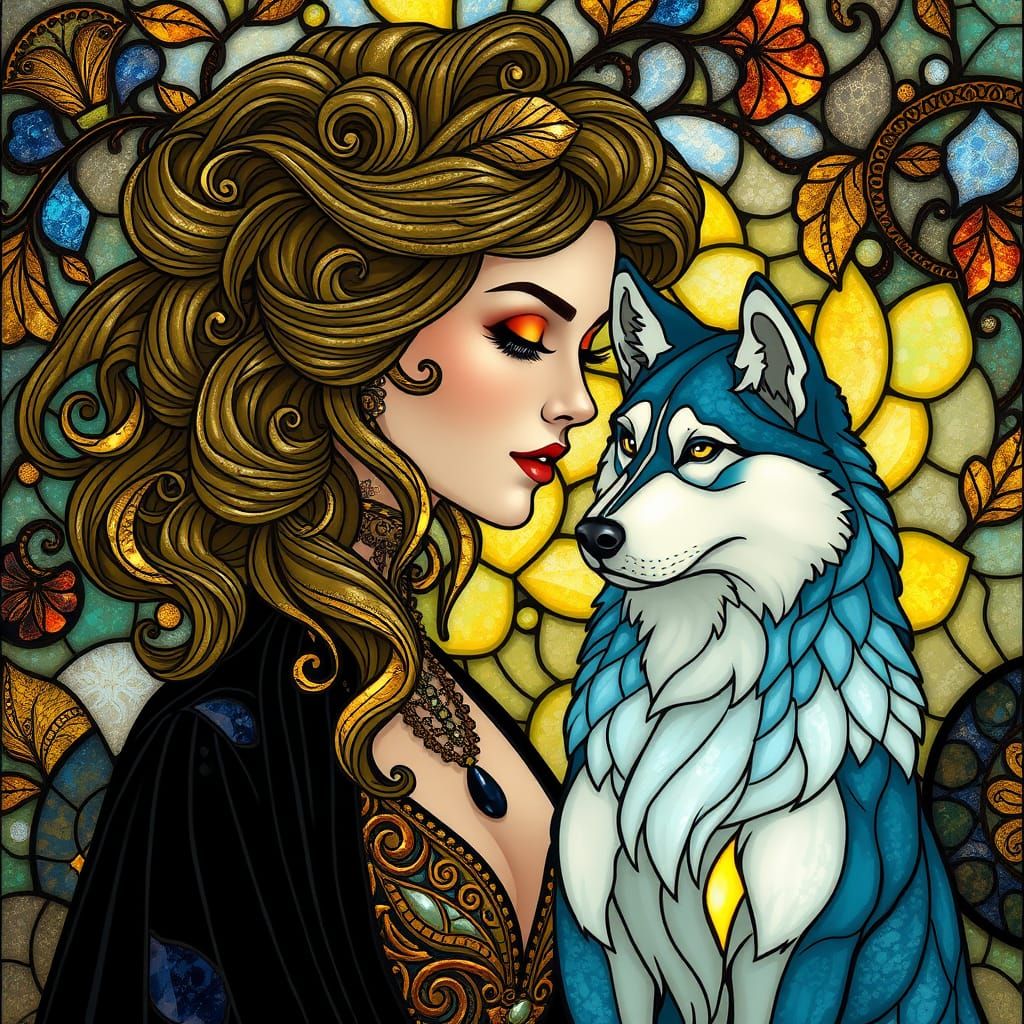 This image shows a regal woman with golden, vine-like curls alongside a husky with an opal coat. They are set within a stained glass mosaic, creating a dreamlike art nouveau scene.