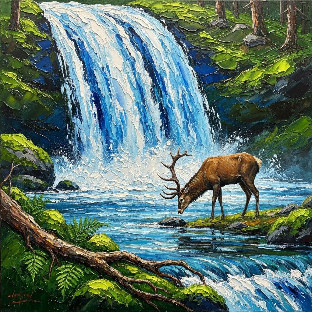 This image showcases a noble stag drinking from a stream beside a powerful waterfall, rendered with thick, sculptural impasto oil paint and dramatic chiaroscuro lighting.