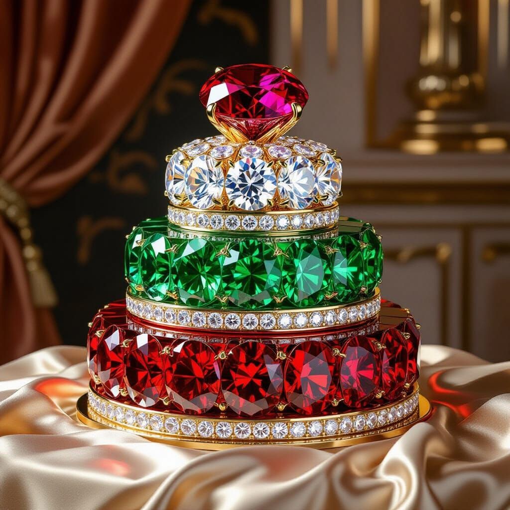 A striking picture of a three-tiered cake. The bottom tier is amber, the middle diamonds, and the top emeralds. A ruby sits on top. Strong colors and dynamic lighting in digital art.