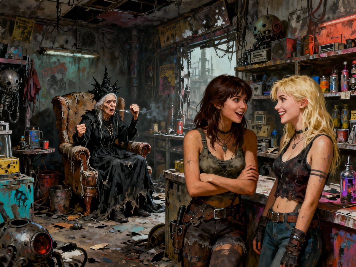 A post-apocalyptic shop filled with items, featuring a grumpy old woman in the background and two young women interacting in the foreground. Rendered in a dark oil painting style with gritty textures and deep colors.