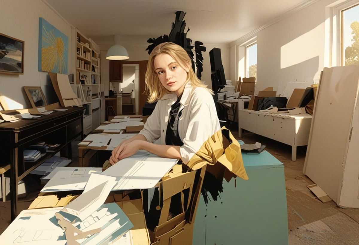 A vibrant, close-up image of a person receiving boxes, set against a magnificent landscape backdrop. Rendered with soft gouache textures and a warm color palette, in a mixed media style.