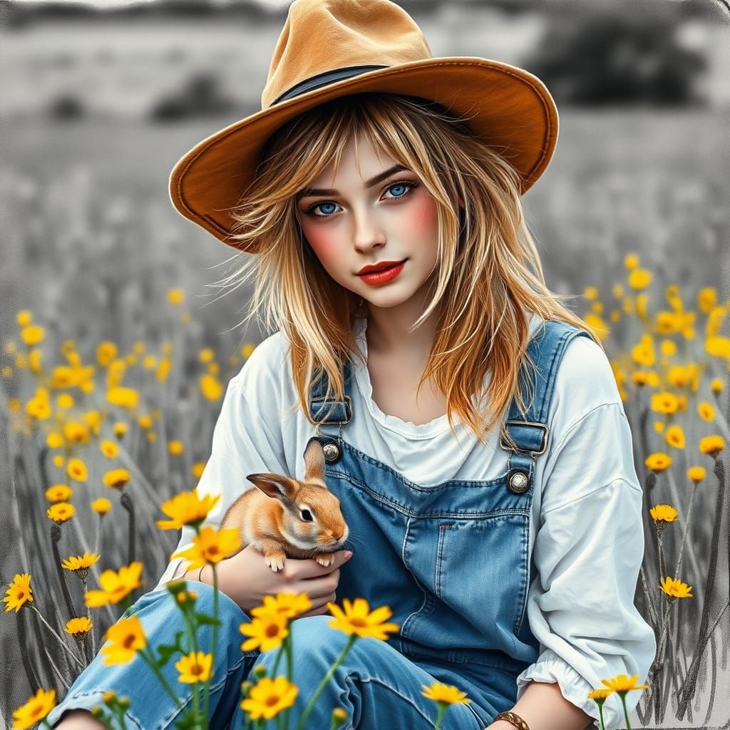 This image is a neo-impressionist masterpiece featuring a beautiful woman with messy blonde hair and a rabbit, set against a blurred black and white field with vibrant yellow flowers. Thick impasto brushstrokes and textured gouache watercolors create a detailed and textured charcoal grey tone sketch.