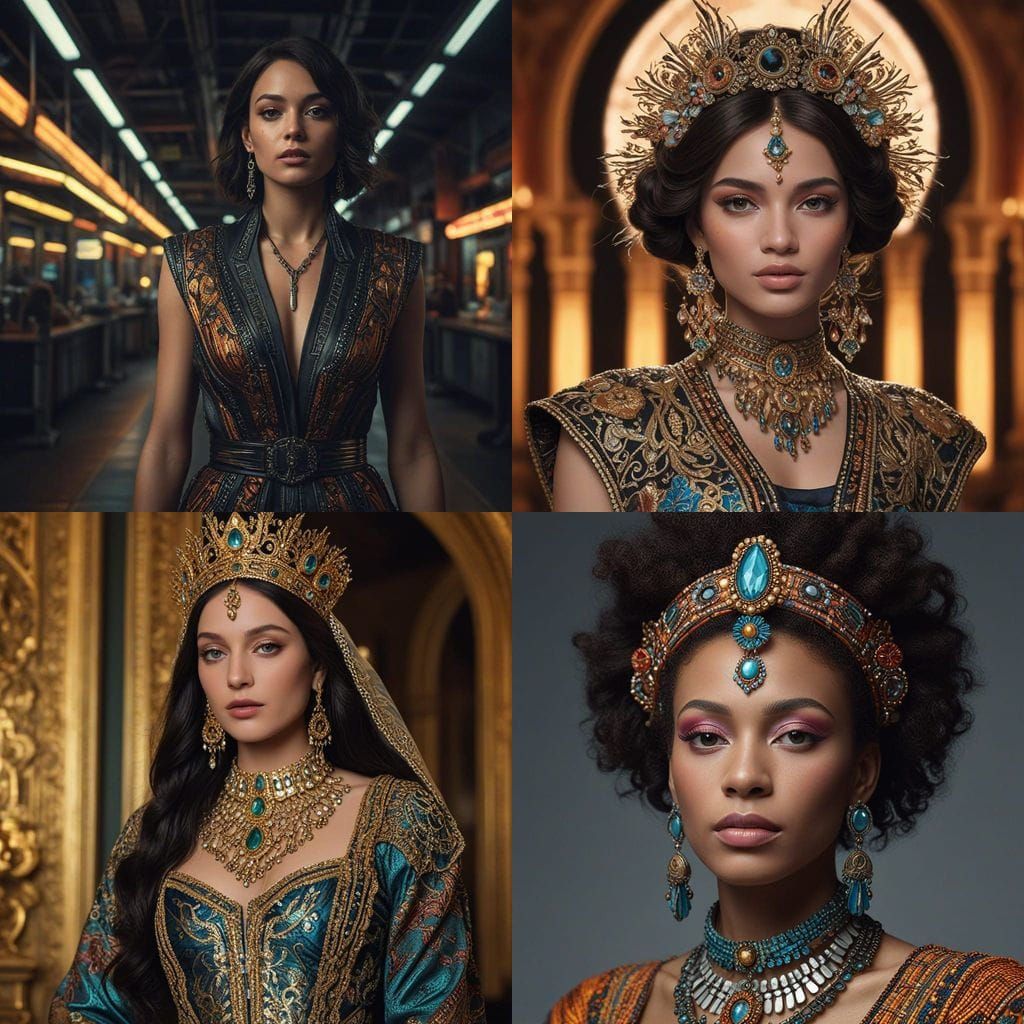 This cinematic portrait captures a beautiful trans woman in intricate, colorful clothing and futuristic jewelry, evoking a sense of drama and atmosphere.
