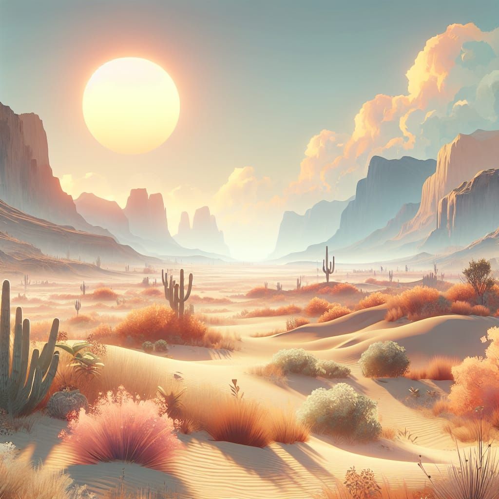 This image shows a serene desert landscape with a golden sun, soft watercolor texture, and soothing pastel tones, evoking a sense of calm and modern bohemian style, perfect for fantasy concept art