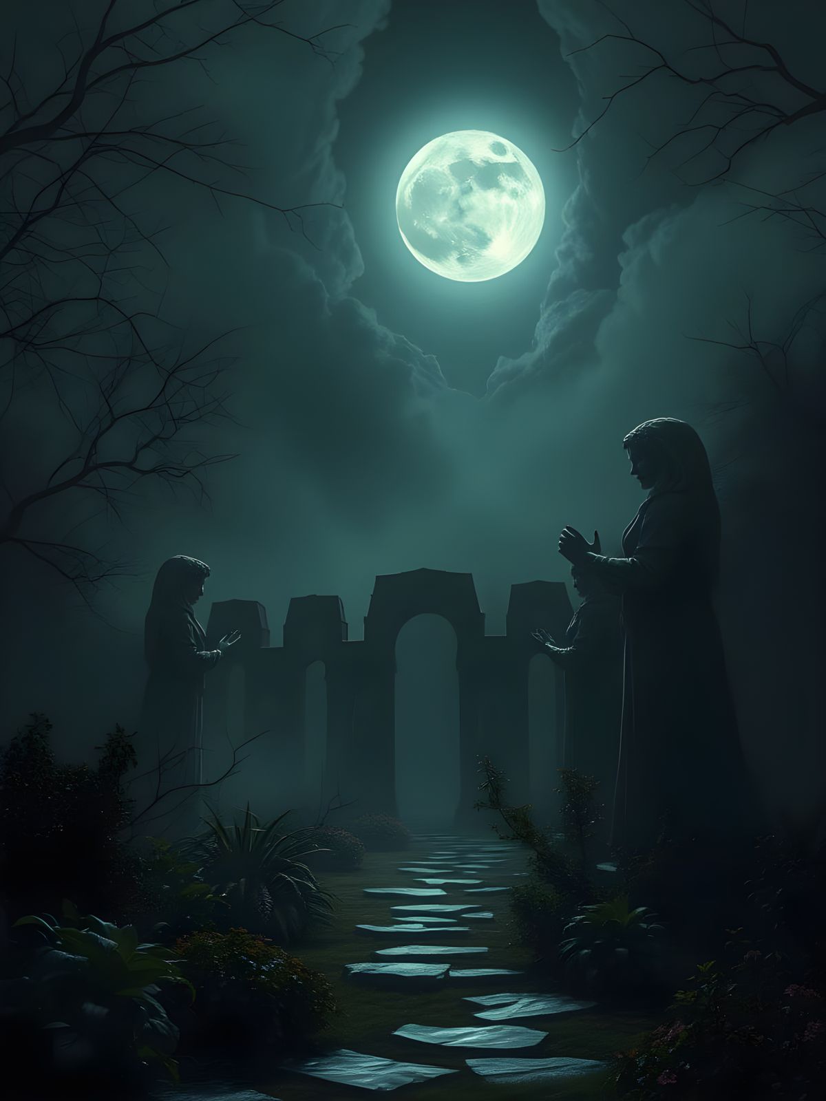 A hyperrealistic oil painting depicts a sinister garden at night. Marble statues are eerily illuminated by diffused moonlight, creating a creepy and detailed fantasy scene.