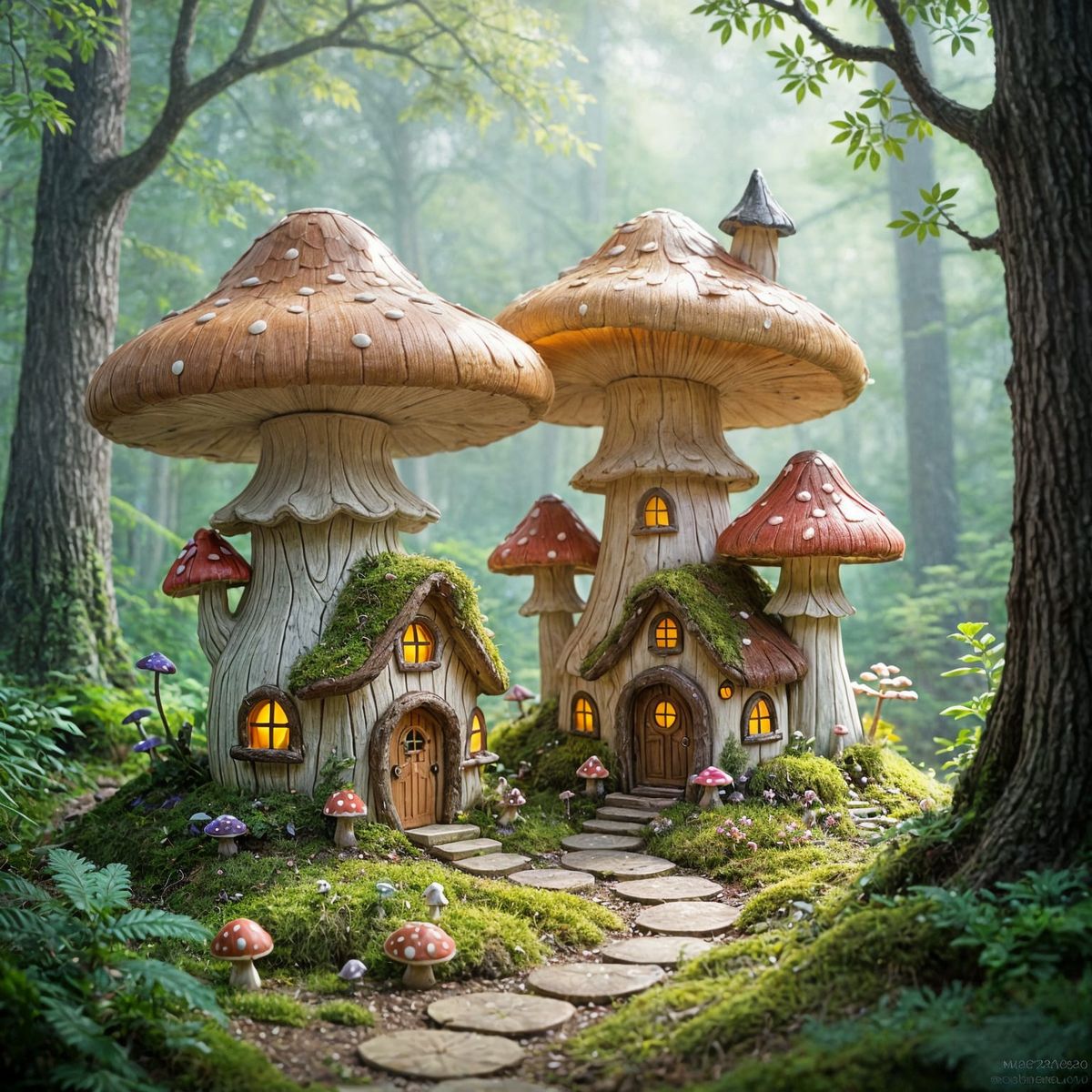 This image shows a whimsical fairy village nestled inside giant, glowing mushrooms within an enchanted forest. Soft pastel colors and gentle lighting create a sense of wonder in this photograph.