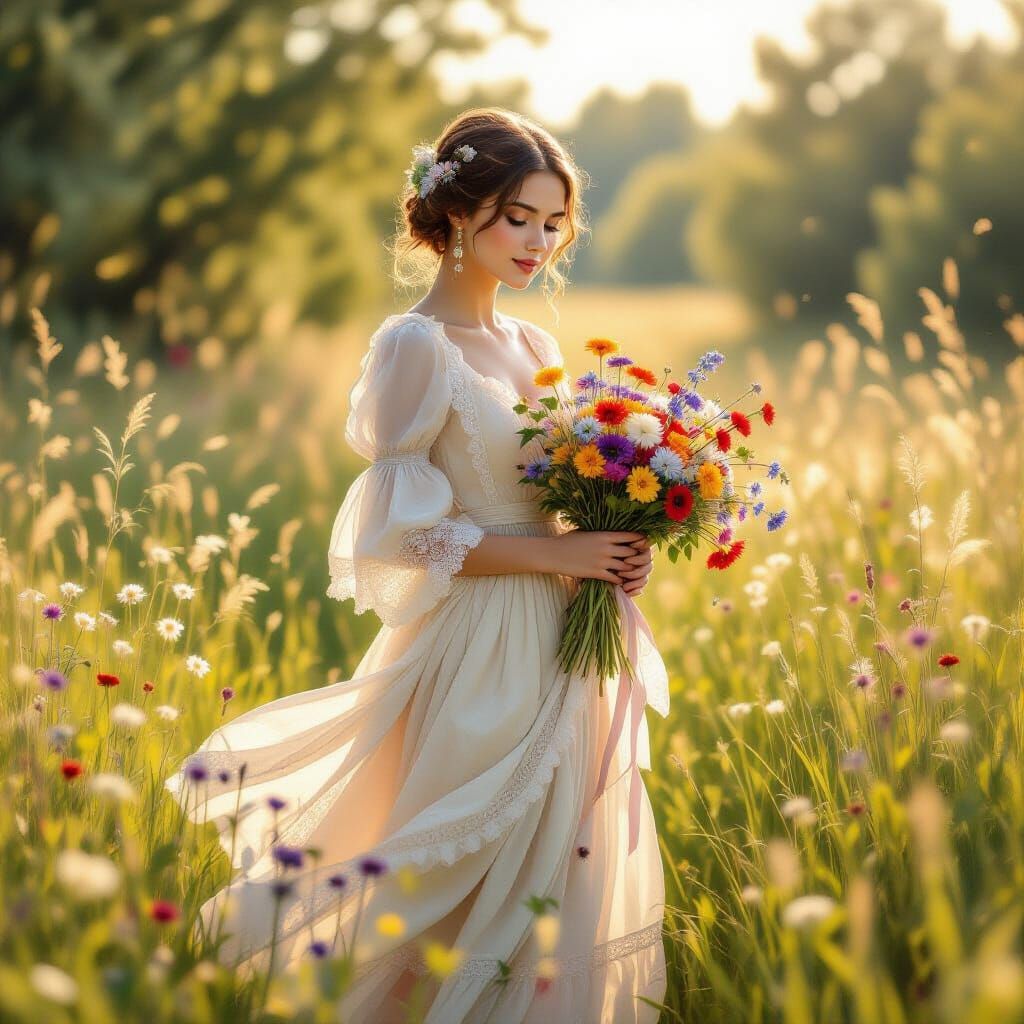 A striking picture of a woman in a vintage dress holding wildflowers in a sunlit meadow. The scene is rendered with soft brushstrokes and a warm color palette in an impressionistic style.
