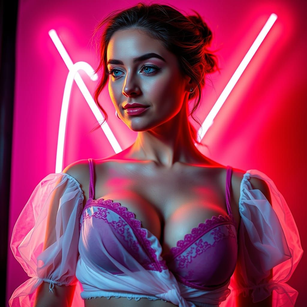This vibrant image features a young redhead woman, lying on her side, with a partially open blouse revealing a hint of lingerie. Her gaze is fixed and enigmatic, surrounded by soft shadows and dramatic lateral lighting, set against a colorful and blurred background, reminiscent of hyper-realistic art sty...