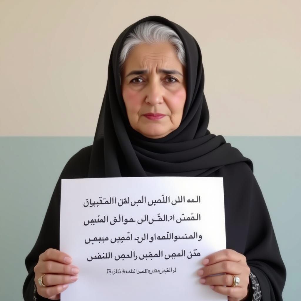 This image shows an Iranian middle-aged woman with a face marked by suffering, wearing a black hijab after being arrested and taken to jail.
