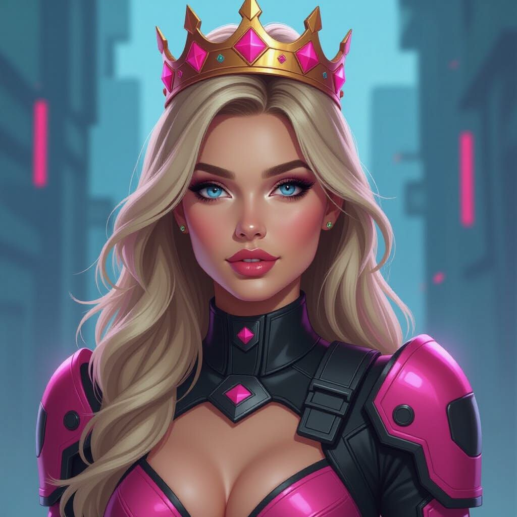 This image shows a blonde woman with blue eyes in a dynamic pose. She is a gaming character in futuristic pink and black armor with an action-packed background, rendered as detailed digital art.