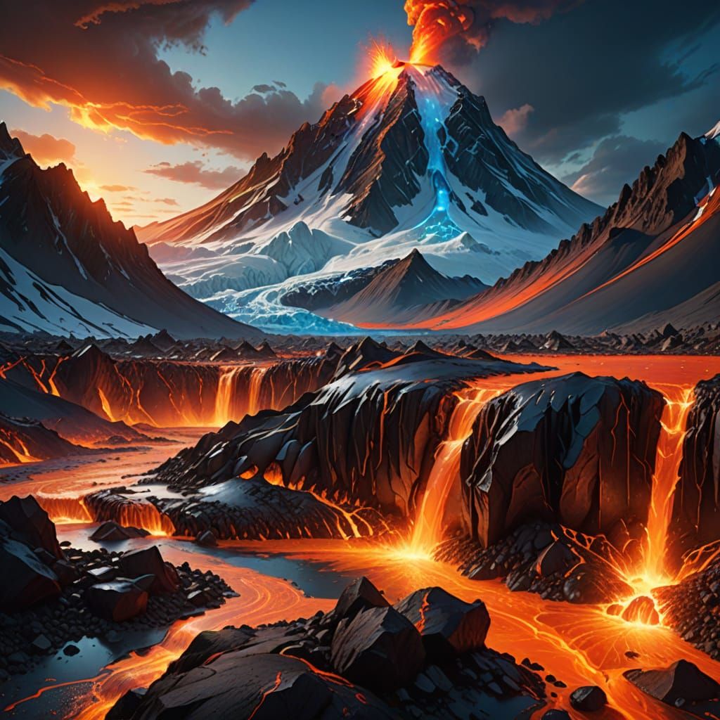 This hyper-realistic digital art captures a dramatic landscape featuring a volcano with vibrant orange lava flows alongside a detailed icy blue glacier. Snowy peaks and golden lighting create a high-contrast, breathtaking scene.