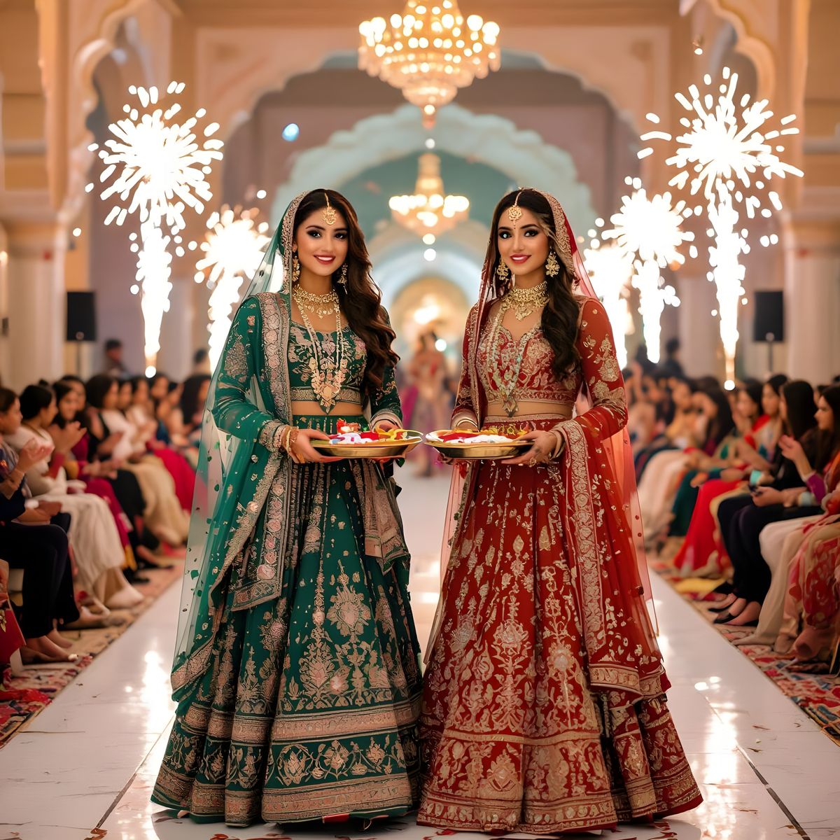 This image shows a vibrant Pakistani Mehndi celebration with girls in traditional dresses holding Mehndi plates. The hall is decorated with festive elements and fireworks.