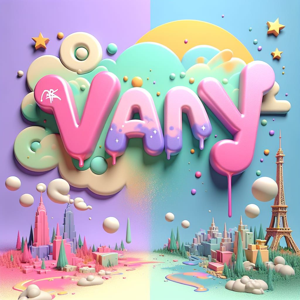 This image features playful, round graffiti letters spelling 'Vany' in pastel pink, purple, mint, and yellow. A soft gradient background with paint splatters and stars enhances the joyful, realistic spray paint aesthetic.