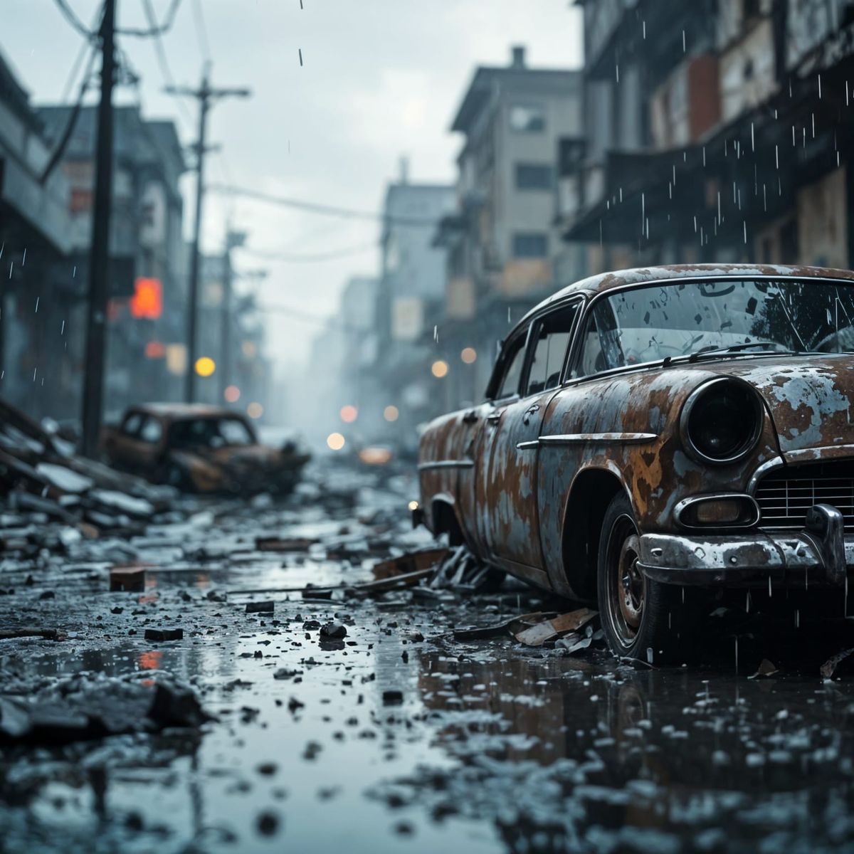 This image shows a small robot crouched in a desolate, rainy post-apocalyptic street, observing a flower. The robot features a retro-futuristic design in orange, black and silver.
