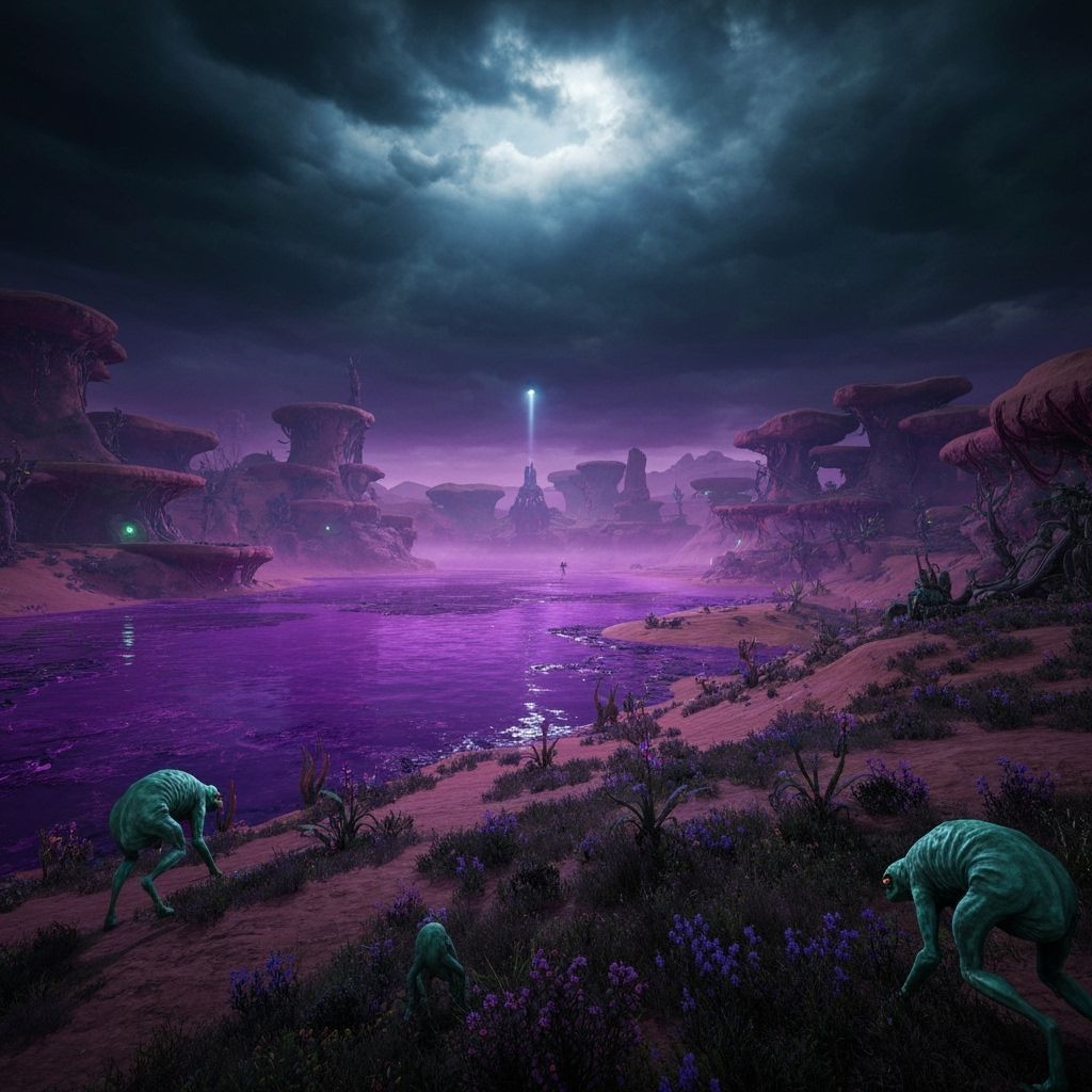 This image showcases a hyperrealistic Agon Wastes from Metroid Prime 2, featuring toxic purple water and a sinister sky. It's rendered with extreme detail, cinematic lighting, and atmospheric dread.