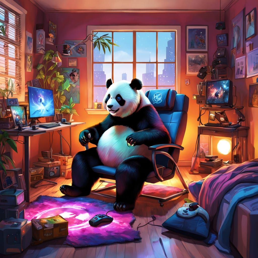 This image shows a giant panda engrossed in video games in a cozy, cluttered bedroom. The digital art features vibrant lighting, soft fur textures, and a fun, relaxed atmosphere in hyperrealism.