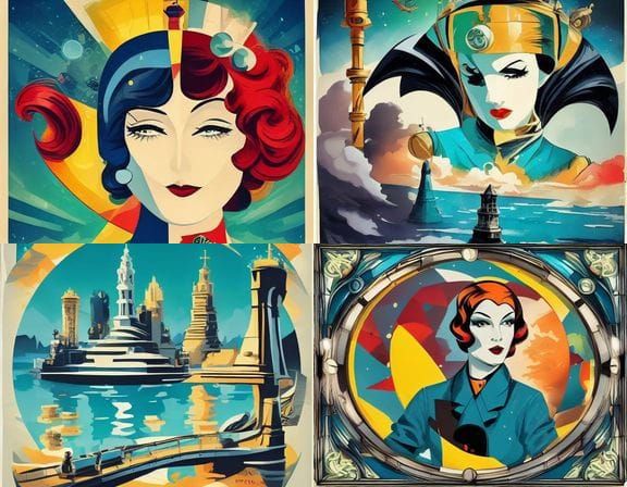This image shows a vintage travel poster advertising a trip to Atlantis. A submarine travels through the ocean, with the city in the background, rendered in an art deco style with vibrant colors.