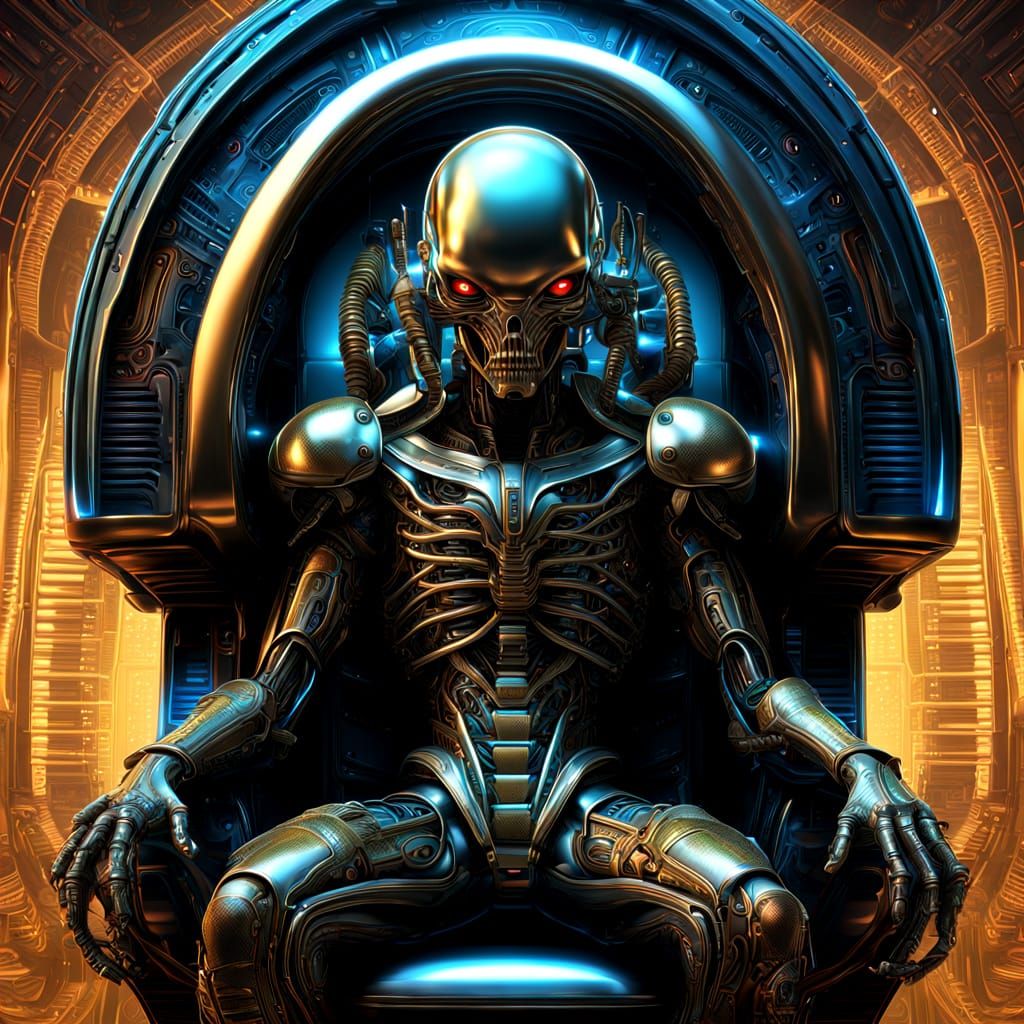 A medium shot of an alien cyborg on a chrome throne. The digital art features glossy metallic surfaces, neon accents, and vibrant colors in a surrealist style. The background has a dark gradient.