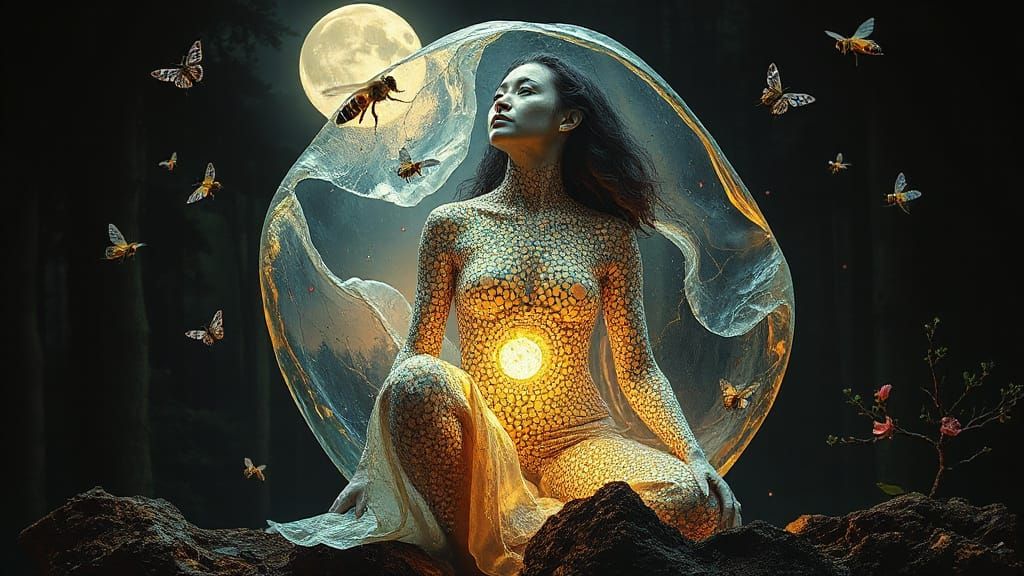 This image depicts a 1970s female sculptor within her vast, abstract artwork. The surreal bio-art collage style features symbolic elements of nature, energy, and transformation under a mystical copper sky.