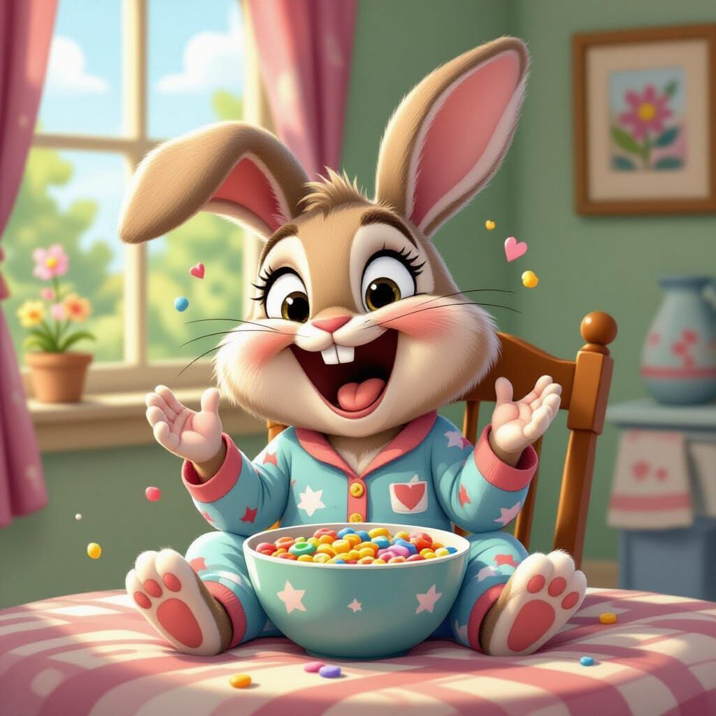 A cheerful bunny wearing pajamas enjoys cartoons and cereal. The image evokes a nostalgic Saturday morning scene with exaggerated expressions and bold, vibrant animation in a 2D style.