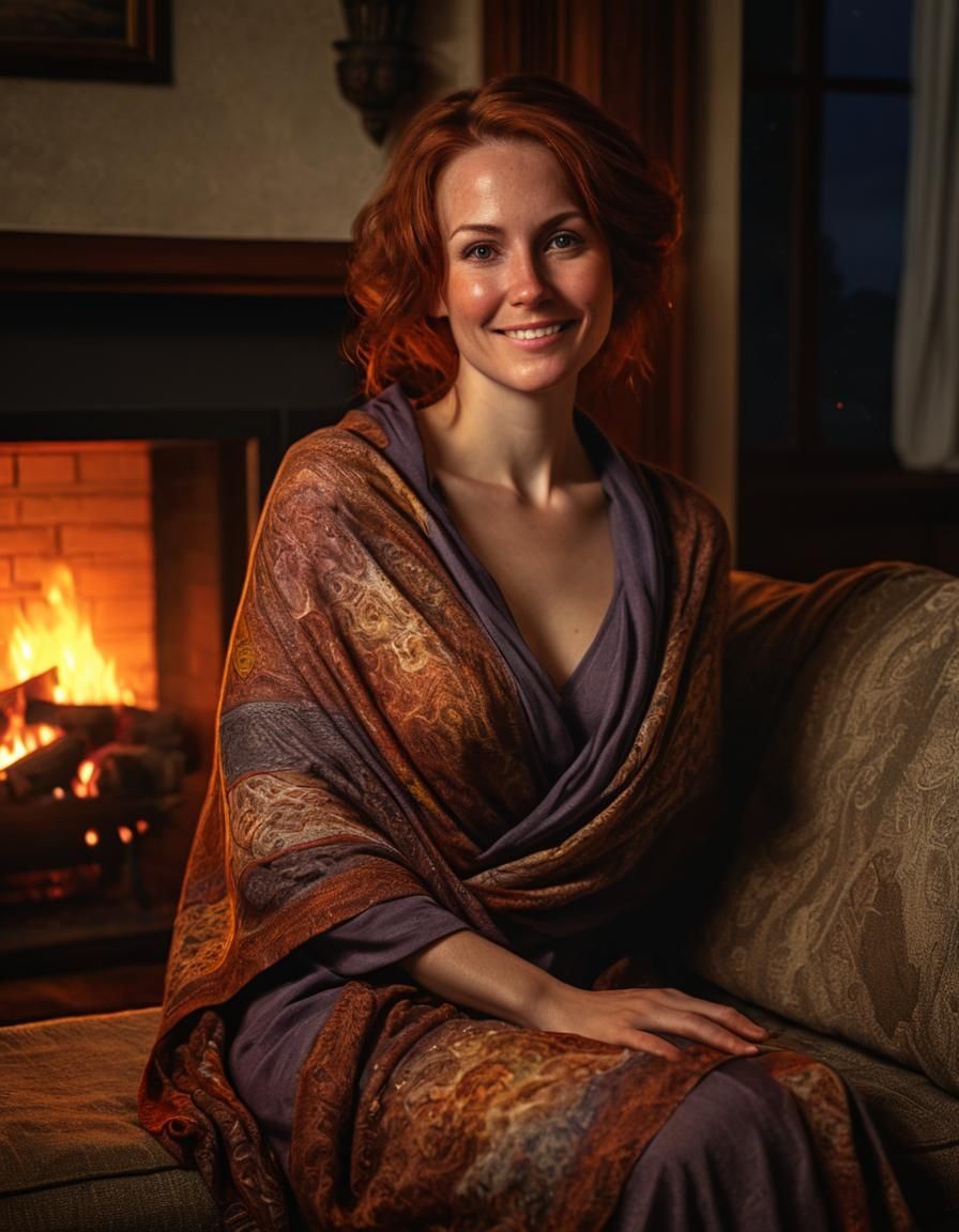This image shows a 38 year old auburn-haired woman relaxing on a couch in front of a fireplace. The scene is bathed in warm colors and lit with starlight in a chiaroscuro oil painting style.