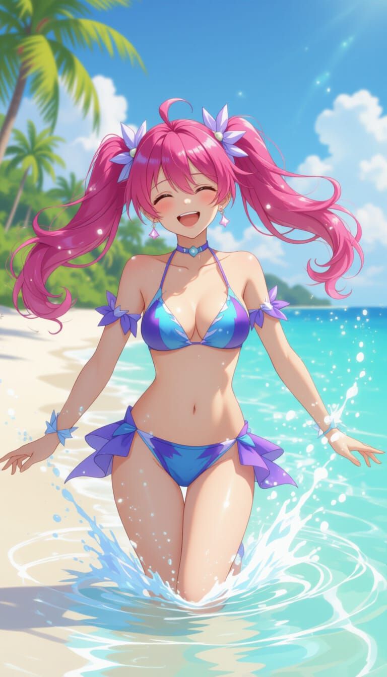 This image shows Star Guardian Jinx in a blue and purple bikini enjoying a tropical beach. Rendered in a detailed anime style with vivid colors and golden hour lighting.