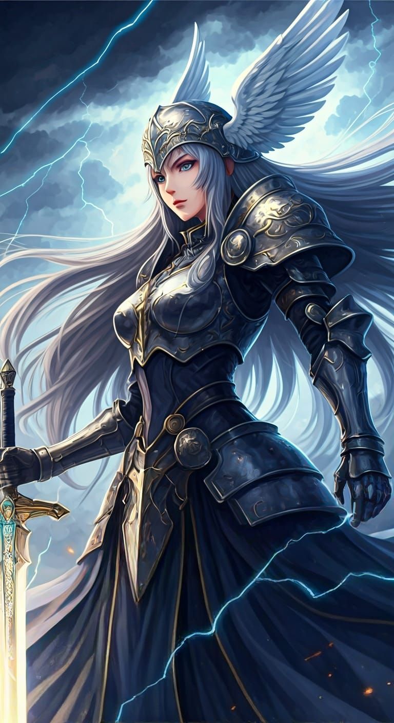 A dynamic image of an anime valkyrie with flowing silver hair and piercing blue eyes, clad in shining armor and wielding a glowing sword. The artwork features high contrast and dramatic lighting.