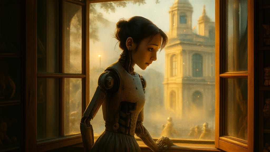 Make the girl look more like an expertly crafted beautiful robot version of a girl, with just a small bit of instrumentation showing on her, make the window she is looking out of a vintage window of an olde toy shoppe, Tim Burton 8K resolution Kodak Ektar lens flare telephoto Behance HD IMAX Unreal Engine ...