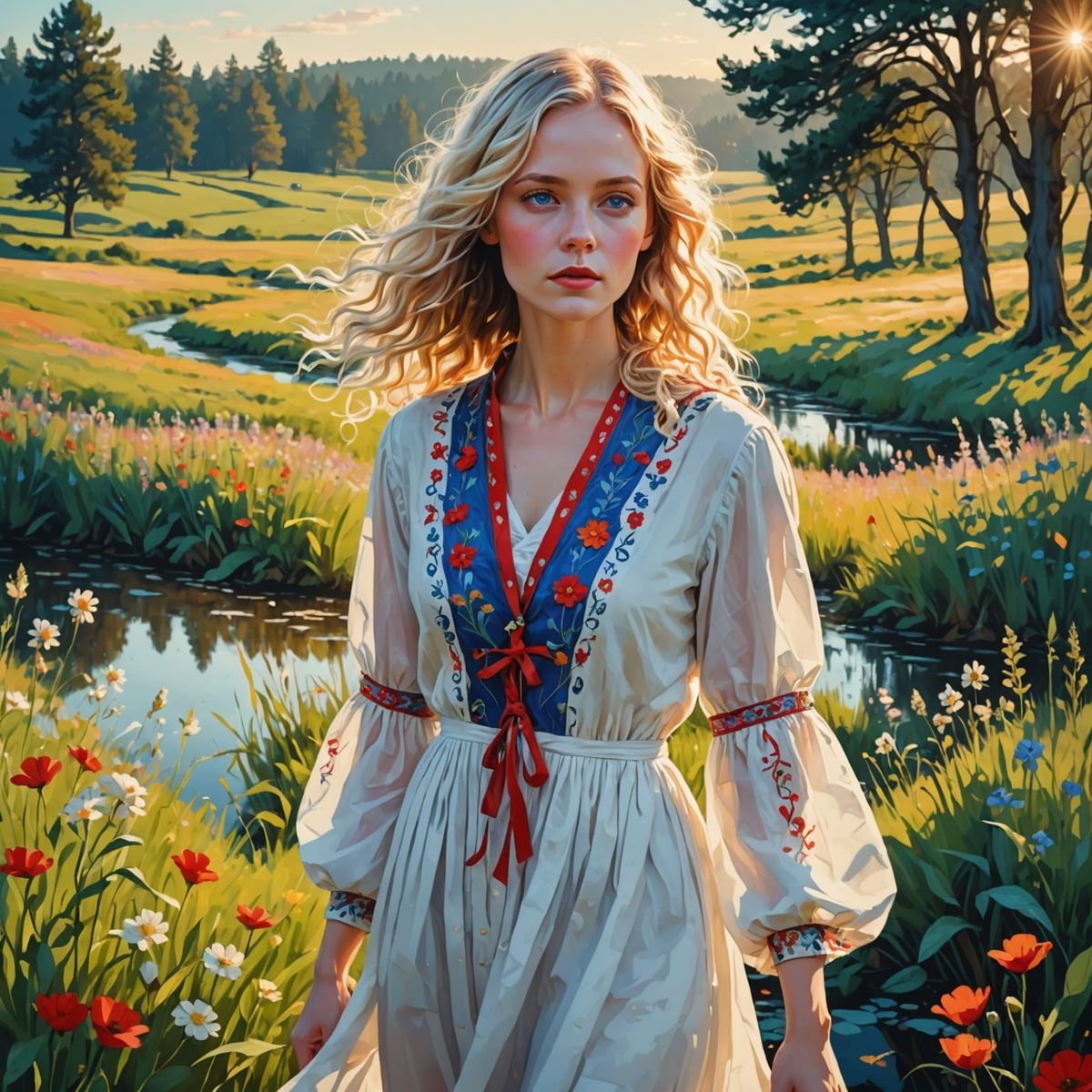 This image shows a serene young woman with blue eyes walking barefoot through a blooming meadow at dawn. The picture uses pastel tones and high detail to capture a dreamy, ethereal scene in a dark fantasy style.
