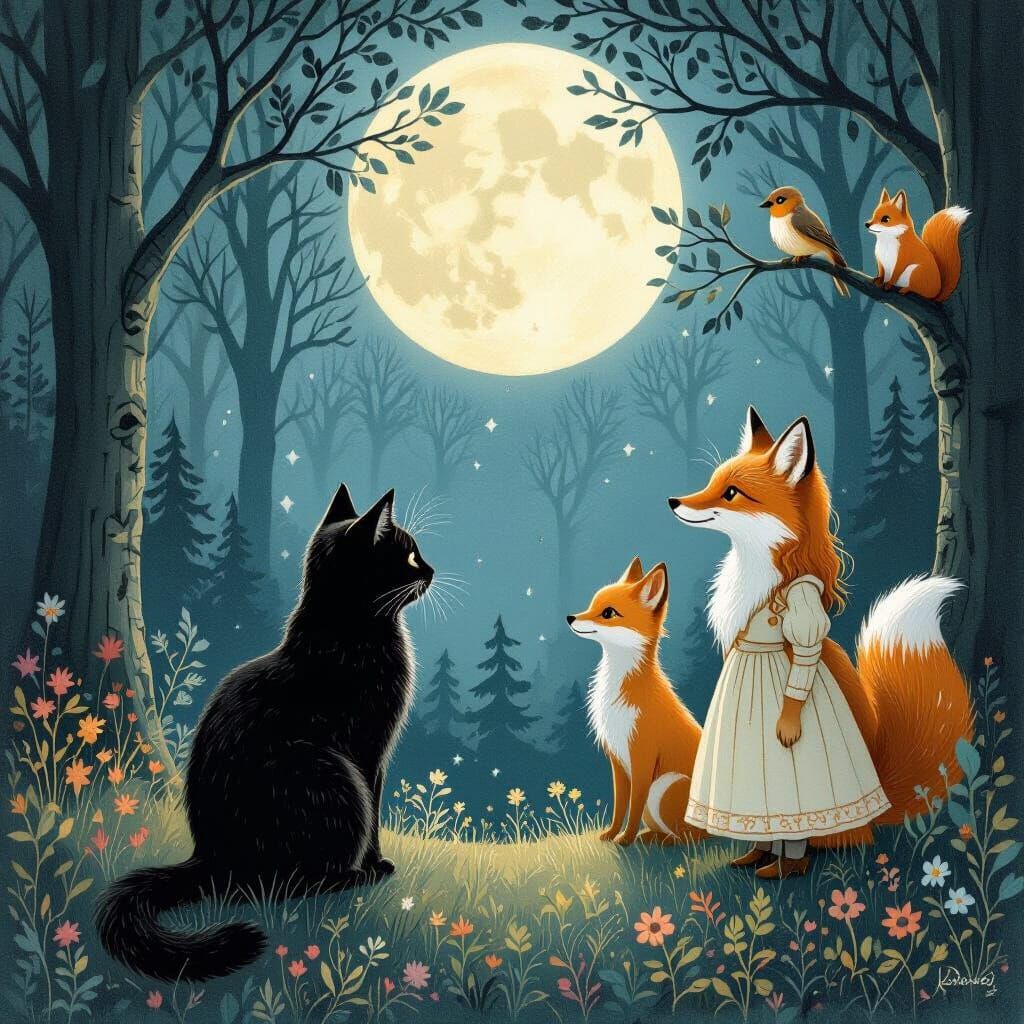 This image shows a cat in a moonlit forest accompanied by a dog, fox, girl, bird and squirrel. The scene is reminiscent of Beatrix Potter's style, with intricate details and whimsical textures.