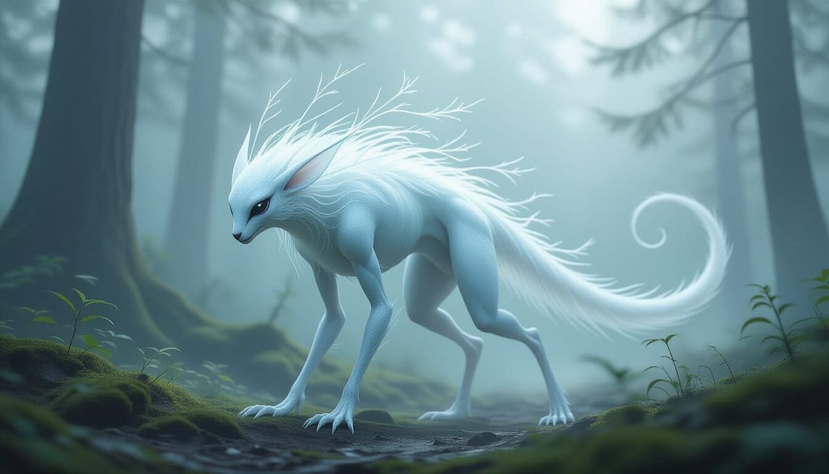 This hyper-realistic image shows a slender, glowing forest creature with feathered tendrils moving silently through misty woods. Its large, dark eyes and silver-veined body create an ethereal, serene presence.