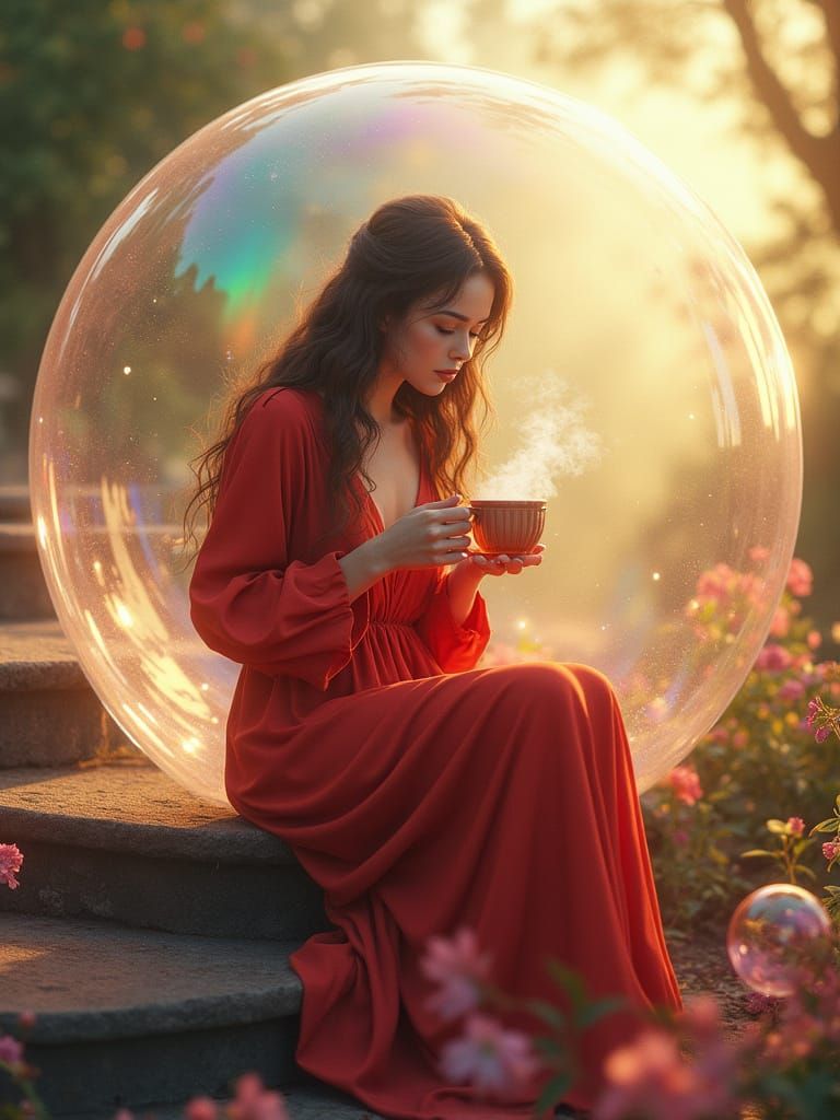This image shows a young woman with a melancholic expression, seated in a garden within a floating bubble. Rendered in a watercolor style with dynamic lighting and intricate detail.