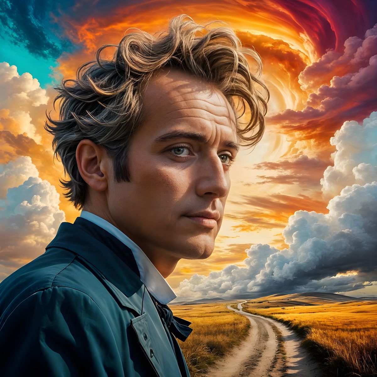 This image shows a scenic landscape symbolizing life's journey. The artwork evokes feelings of nostalgia and forward momentum, rendered in a painterly style.