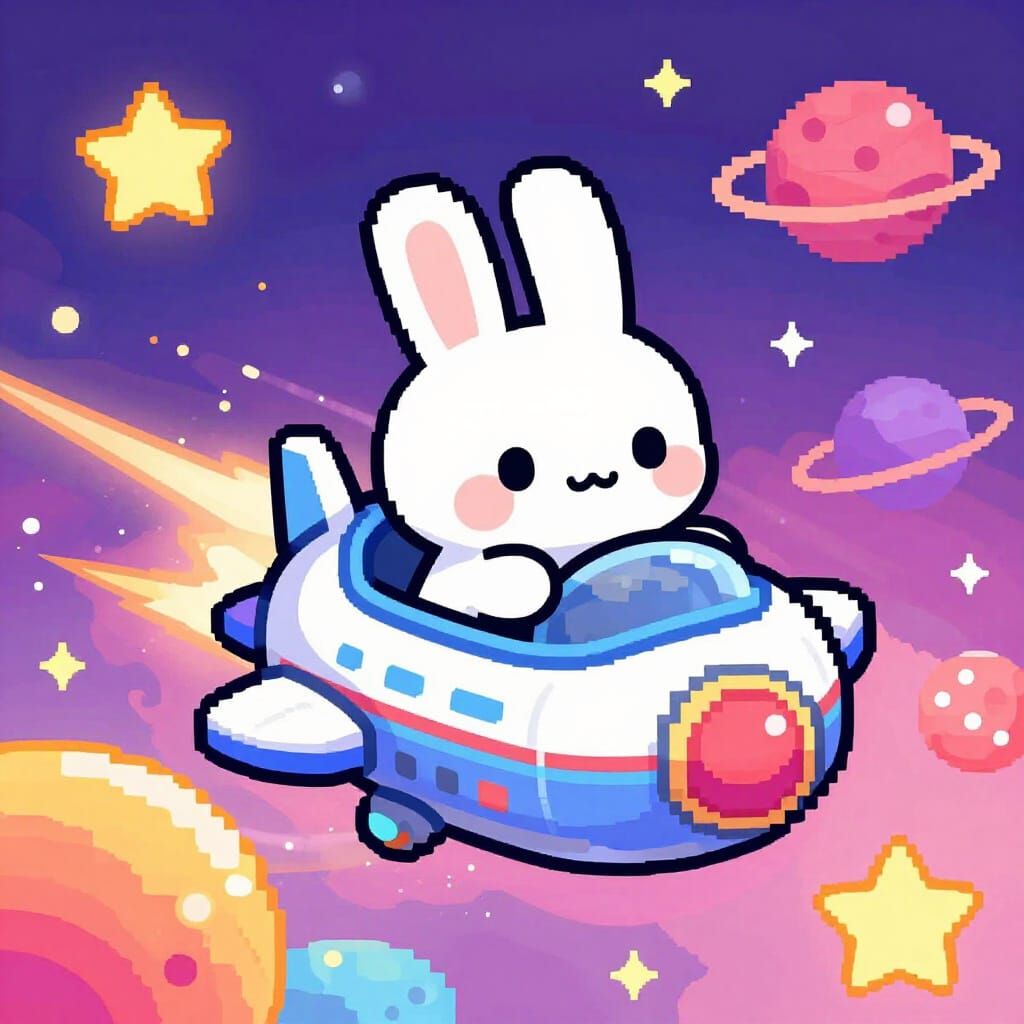 This image shows a cute, chibi rabbit flying a retro spaceship through a bright, candy-colored nebula. It features vibrant 16-bit pixel art graphics and a playful cosmic scene.