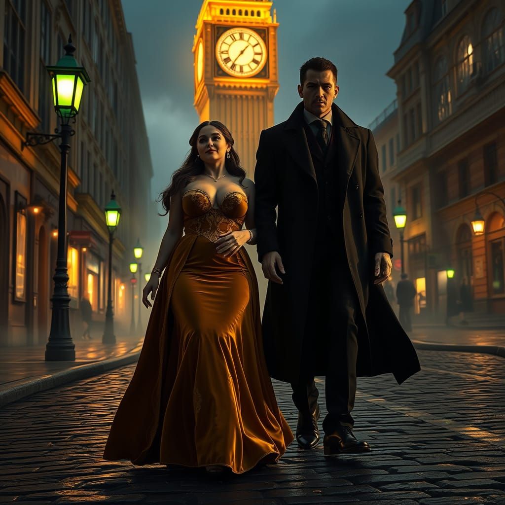 This image shows a curvy woman in a deep yellow velvet gown with golden embroidery confidently walking beside a tall man in a dark coat on a worn cobblestone street at dusk, set against a moody background of flickering city lights, misty fog, and a giant clock tower.