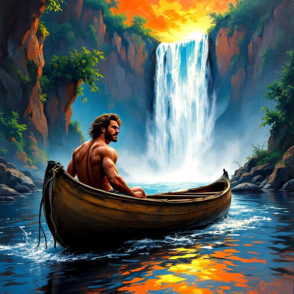 This image captures a close-up of a handsome man in a canoe beside a majestic waterfall, set against a stunning sunset backdrop with flowing lines and heavy brush strokes.
