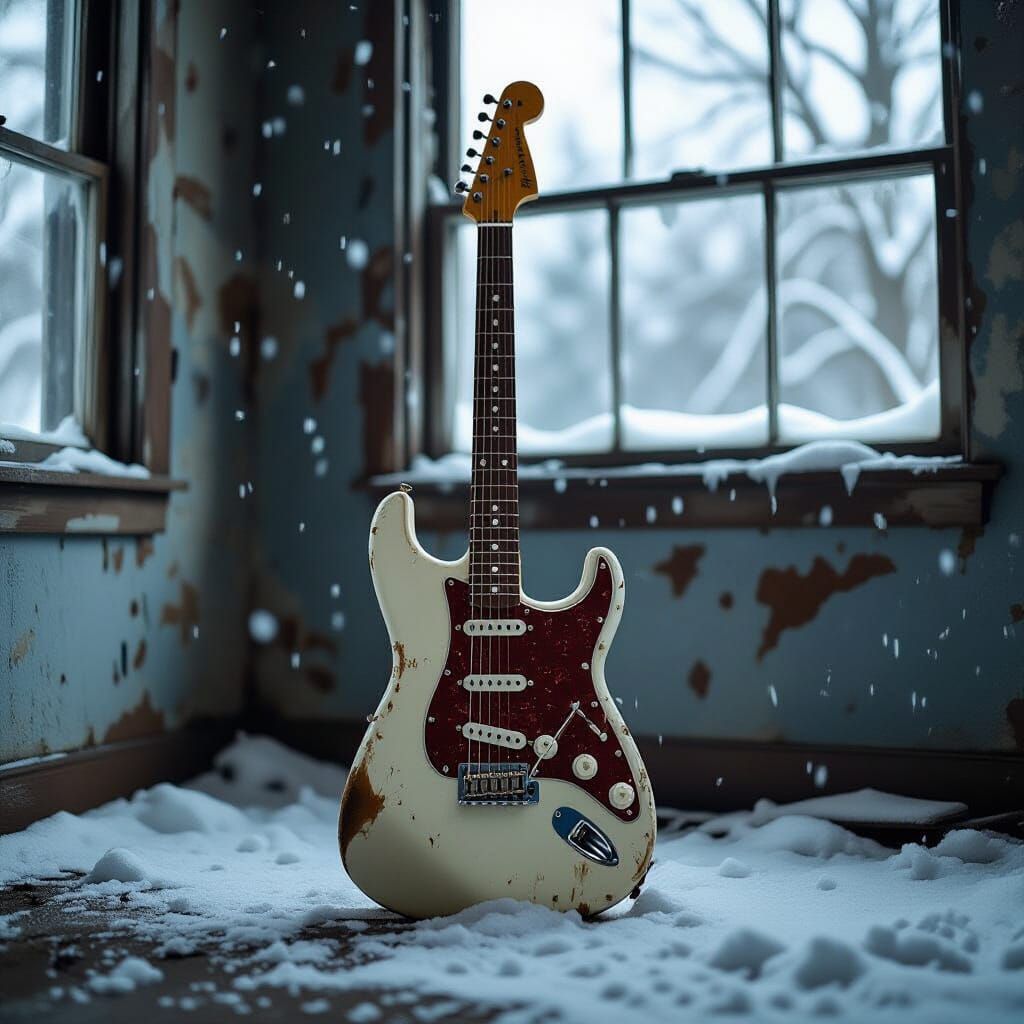 This image shows a worn vintage white Stratocaster with a red pickguard in a desolate room. Soft snowflakes fall outside the broken window, with ice forming on the guitar, in a desolate digital art style.