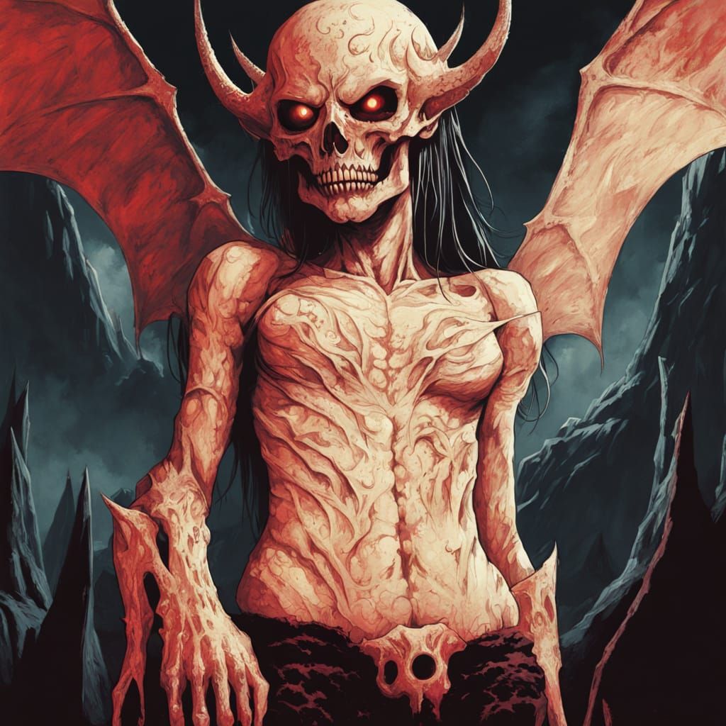 A dark fantasy illustration of a hell-creature fae with glowing horns in a fiery abyss. Features intricate demonic skin textures and ethereal eyes, in a gothic horror art style.