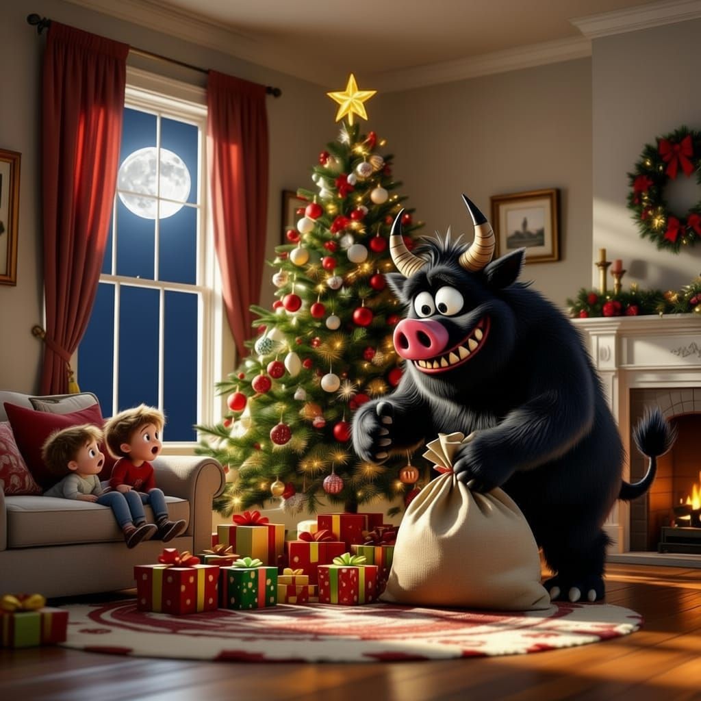 A Disney/Pixar style 3D render shows a frightening black monster with a pig's snout collecting Christmas decorations while two children hide. Cinematic lighting enhances the scene.